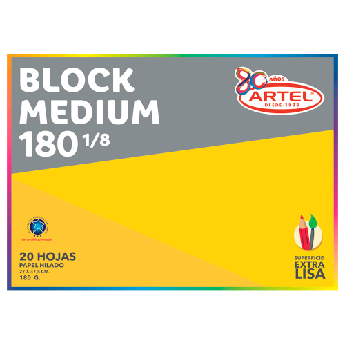 VolverBlock Medium Artel, con 20 hojas de 1/8 de papel hilado de 180gr en tamaño 27×37,5 cm, diseño de alta resistencia con tapa para evitar daños, sistema de engomado superior y calidad que soporta el traspaso de materiales entre ambas caras del papel. Te serán de una enorme utilidad para técnicas secas o tempera. Para uso escolar o profesional.